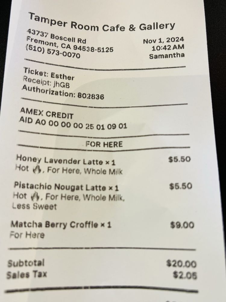 Tamper Room Cafe & Gallery is a charming cafe in Fremont, CA that offers a cozy atmosphere and a unique selection of beverages. Known for their creative drinks like the honey lavender latte and ube latte, this cafe also features art from local artists that are available for purchase. The cafe's vibe is perfect for studying or casual meetings, with free Wi-Fi and plenty of outlets. Customers appreciate the friendly staff and the variety of handmade goods for sale. While some find the drink prices a bit high, the overall experience of Tamper Room is delightful. It's a must-visit spot for those looking for a relaxing coffee spot with a touch of creativity and charm.